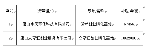 按照《唐山市财政局唐山市人力资源和社会保障局关于落实冀财社〔2018〕21号文件的通知》(唐财社〔2019〕1号)规定,经对高新区2家创业孵化基地房租物业水电费申报材料进行审核,同时根据唐山金恒房地产评估有限公司对该基地地价、设备投入、租金等方面的综合评估,共需从就业扶持资金中支出¥1737549.6元,现将补贴情况进行公示,公示期为3天,公示期内如有异议,请向唐山高新区人力资源和社会保障局人才交流中心反映。