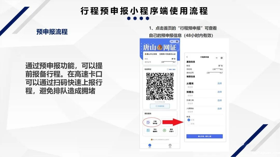 请区外来(返)区人员提前下载“唐山网证”小程序,并完成注册和身份认证,完整填写行程信息,目的地必须填写高新区及所去镇(街道)。(具体操作流程附后)