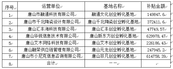 按照《唐山市财政局唐山市人力资源和社会保障局关于落实冀财社〔2018〕21号文件的通知》(唐财社〔2019〕1号)规定,经对高新区7家创业孵化基地房租物业水电费申报材料进行审核,同时根据唐山中颐达资产评估有限公司对该基地地价、设备投入、租金等方面的综合评估,共需从就业扶持资金中支出¥2288877.26元,现将补贴情况进行公示,公示期为3天,公示期内如有异议,请向唐山高新区人力资源和社会保障局人才交流中心反映。