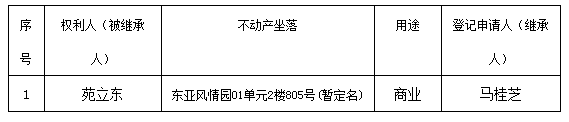 根据《不动产登记暂行条例实施细则》第十四条的规定,经初步查验,不动产登记机构拟对下列不动产权利办理不动产继承登记。根据《不动产登记暂行条例实施细则》第十七条的规定,现予公告。如有异议,请自本公告之日起90个工作日内,将异议书面材料送达不动产登记机构。逾期无人提出异议或者异议不成立的,不动产登记机构将予以登记。
