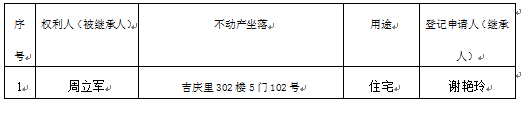 根据《不动产登记暂行条例实施细则》第十四条的规定,经初步查验,不动产登记机构拟对下列不动产权利办理不动产继承登记。根据《不动产登记暂行条例实施细则》第十七条的规定,现予公告。如有异议,请自本公告之日起90个工作日内,将异议书面材料送达不动产登记机构。逾期无人提出异议或者异议不成立的,不动产登记机构将予以登记。