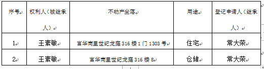 根据《不动产登记暂行条例实施细则》第十四条的规定,经初步查验,不动产登记机构拟对下列不动产权利办理不动产继承登记。根据《不动产登记暂行条例实施细则》第十七条的规定,现予公告。如有异议,请自本公告之日起90个工作日内,将异议书面材料送达不动产登记机构。逾期无人提出异议或者异议不成立的,不动产登记机构将予以登记。