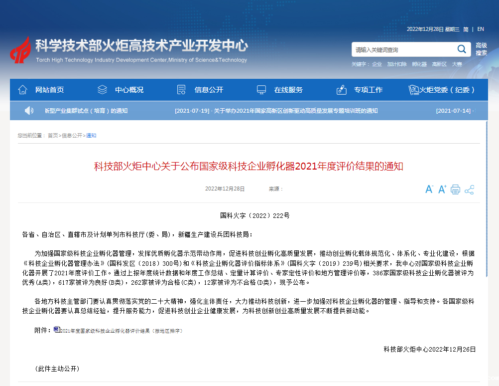 据悉,科技部火炬中心为了加快国家级科技企业孵化器体系化、专业化建设,推动科技创新创业高质量发展,根据《科技企业孵化器管理办法》(国科发区〔2018〕300号)和《科技企业孵化器评价指标体系》(国科火字〔2019〕239号)相关要求,对1277家国家级科技企业孵化器开展了2021年度评价工作。通过上报年度统计数据和年度工作总结、定量计算评价、专家定性评价和地方管理评价等程序,386家国家级科技企业孵化器被评为优秀(A类),617家被评为良好(B类),262家被评为合格(C类),12家被评为不合格(D类)。