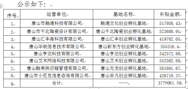 按照《唐山市财政局唐山市人力资源和社会保障局关于落实冀财社〔2018〕21号文件的通知》(唐财社〔2019〕1号)规定,经对高新区8家创业孵化基地房租物业水电费申报材料进行审核,同时根据唐山中颐达资产评估有限公司对该基地地价、设备投入、租金等方面的综合评估,共需从就业扶持资金中支出¥3720061.59元,现将补贴情况进行公示,公示期为3天,公示期内如有异议,请向唐山高新区人力资源和社会保障局人才交流中心反映。