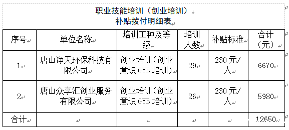 根据《河北省人社厅河北省财政厅关于印发河北省职业技能培训职业(工种)目录及补贴标准(2022版)的通知》(冀人社字〔2022〕228号)、《河北省人社厅关于转发中国就业培训技术指导中心马兰花创业培训技术文件的通知》(冀人社字〔2021〕70号)等文件规定,经审核,2023年10月申请就业补助资金的单位和人员符合享受补贴条件,此次补贴共计12650元。现将拟享受职业技能培训(创业培训)补贴情况进行公示。