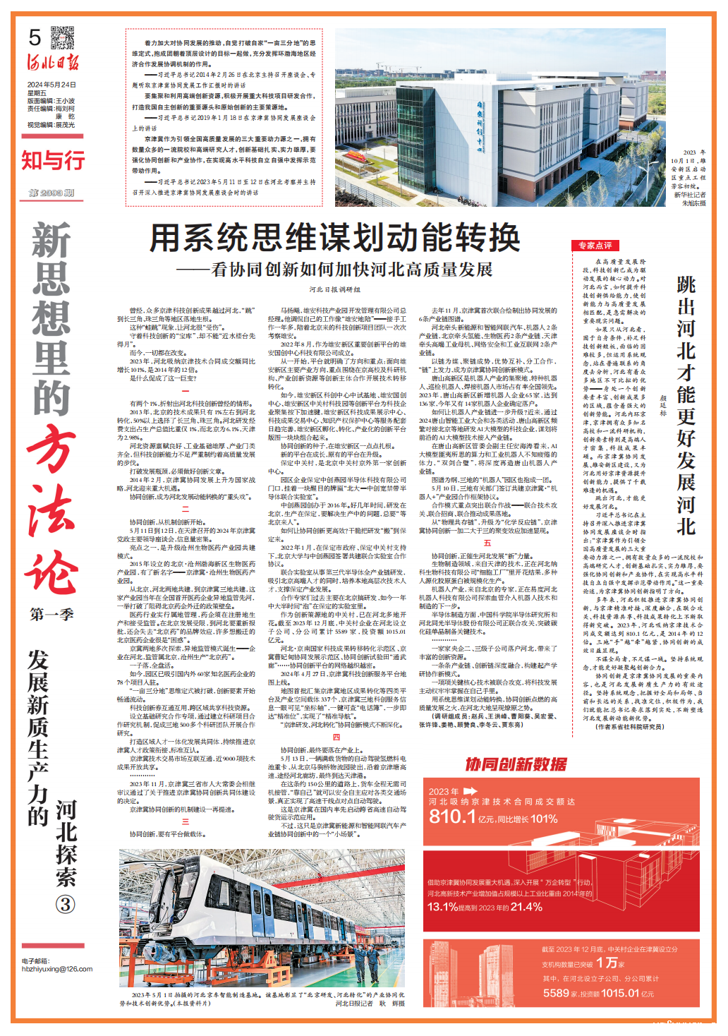协同创新是京津冀协同发展的重要内容,也是河北发展新质生产力的有效途径。坚持系统观念,把握好全局和局部、当前和长远的关系,找准定位,积极作为,我们就能把总书记要求落到实处,不断塑造河北发展新动能新优势。