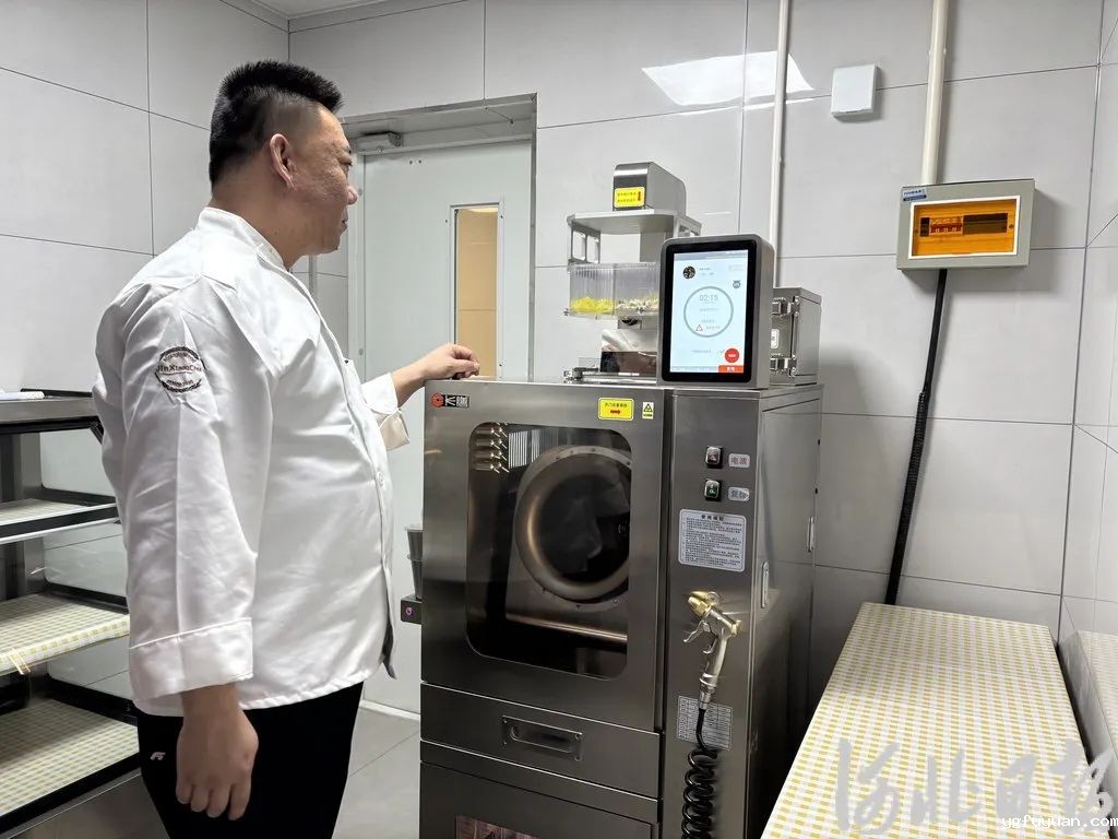”要做的下道菜,是唐山特色菜鸭黄豆角。只见厨师在炒菜机器人的显示屏上输入菜名,然后把预备好的豆角和鸭蛋黄碎末分别放入料盒中,点击显示屏上的“烹饪”键,上面立刻显示出这道菜的制作时间——48秒。