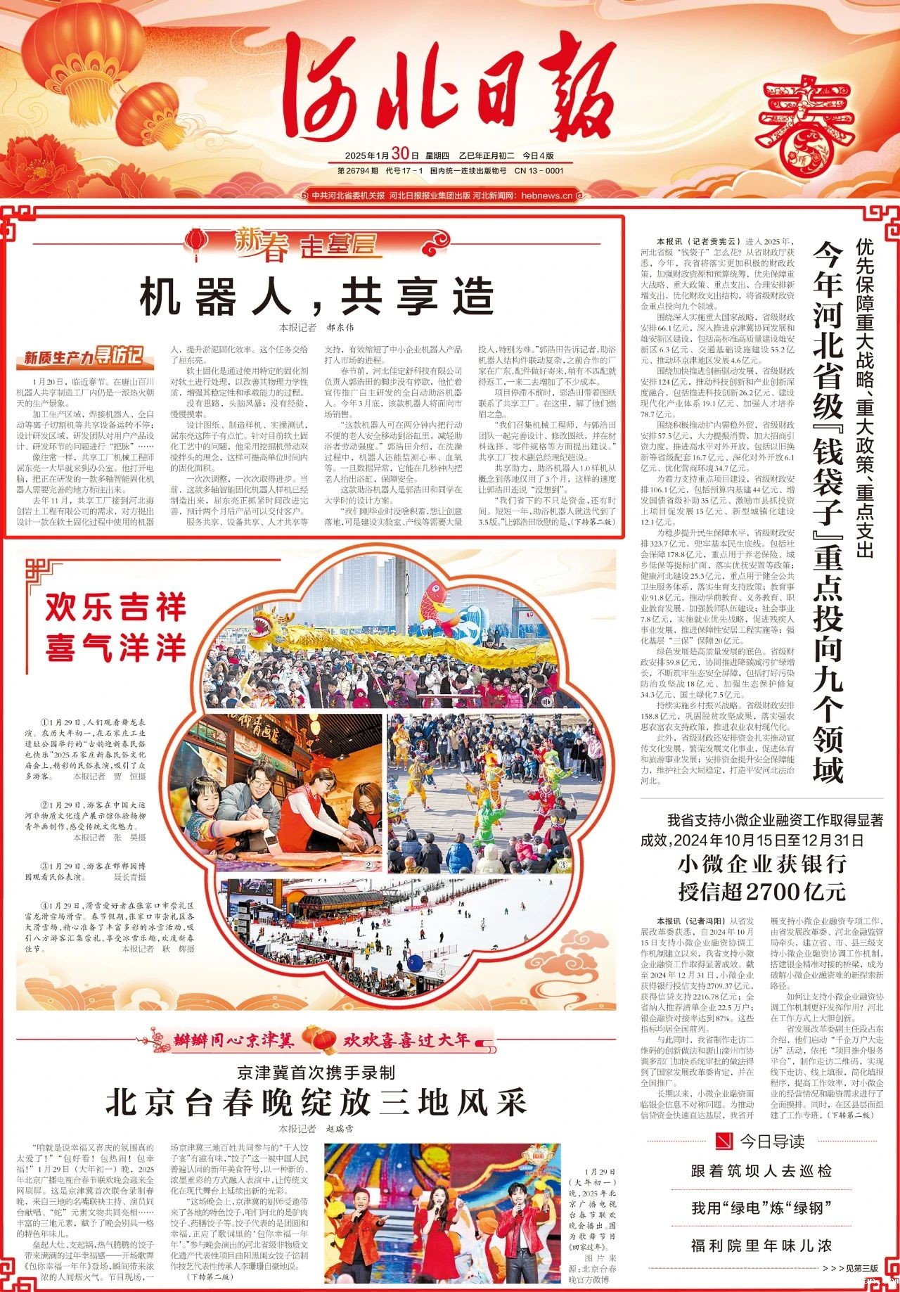 1月30日出版的《河北日报》头版头条聚焦唐山高新区,以《机器人,共享造》为题,对唐山高新区机器人共享制造工厂进行报道。详情如下: