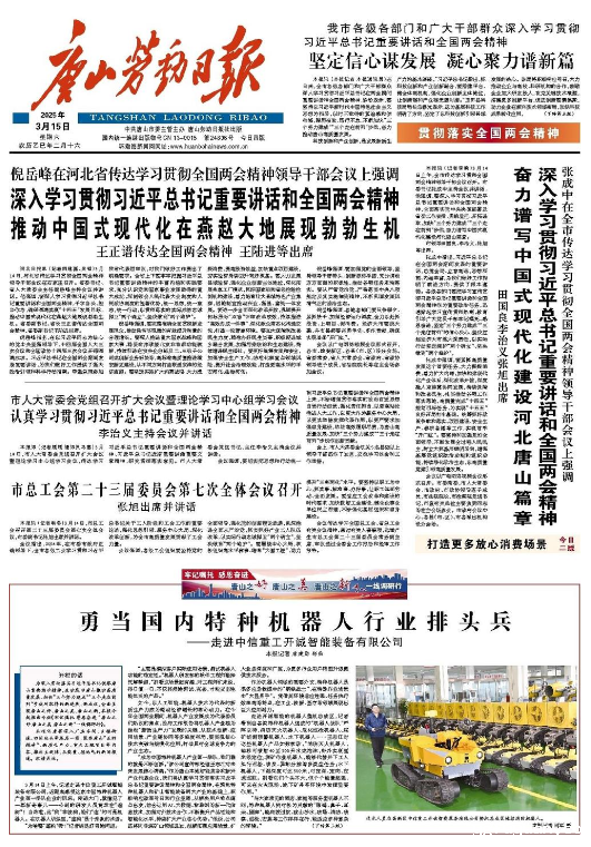 3月15日,唐山劳动日报头版推出专栏《牢记嘱托 感恩奋进 “唐山之好 唐山之美 唐山之新”一线调研行》。专栏首条宣传报道高新区中信重工开诚智能装备有限公司。现将原文转载如下: