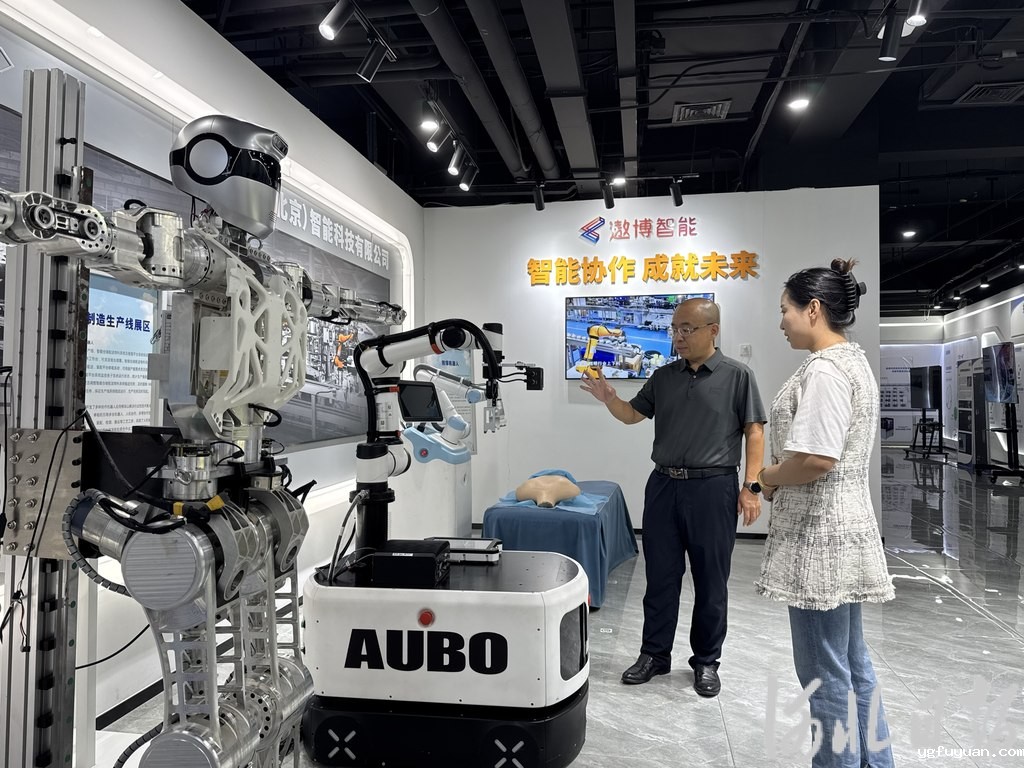 8月20日,在位于北京的中关村机器人产业创新中心,总经理蒙洋(左)向访客介绍展品。河北日报记者 米彦泽摄