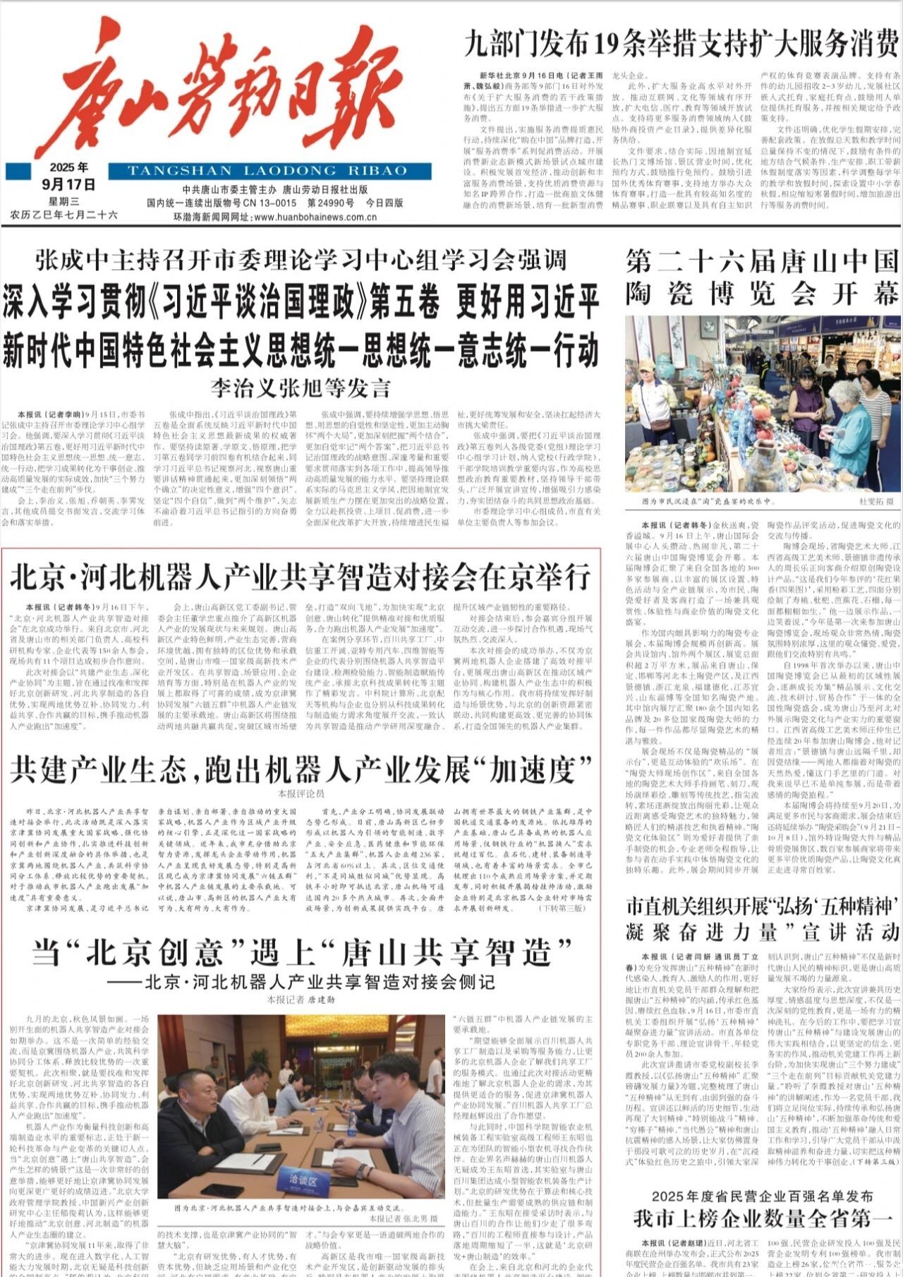 北京的创新优势、唐山的制造优势,释放出1+1>2的聚合效应,在机器人产业协同分工中凝聚起强大合力。以共享工厂优化制造分工,以场景共建深化应用协同,以双向飞地畅通创新衔接,以政策共商保障分工落地,形成区域产业链,打造产业生态圈,一定能推动唐山机器人产业跑出发展“加速度”,实现优势互补、协同发力、利益共享、合作共赢的目标,为推动区域产业高质量发展、建设制造强国贡献力量。