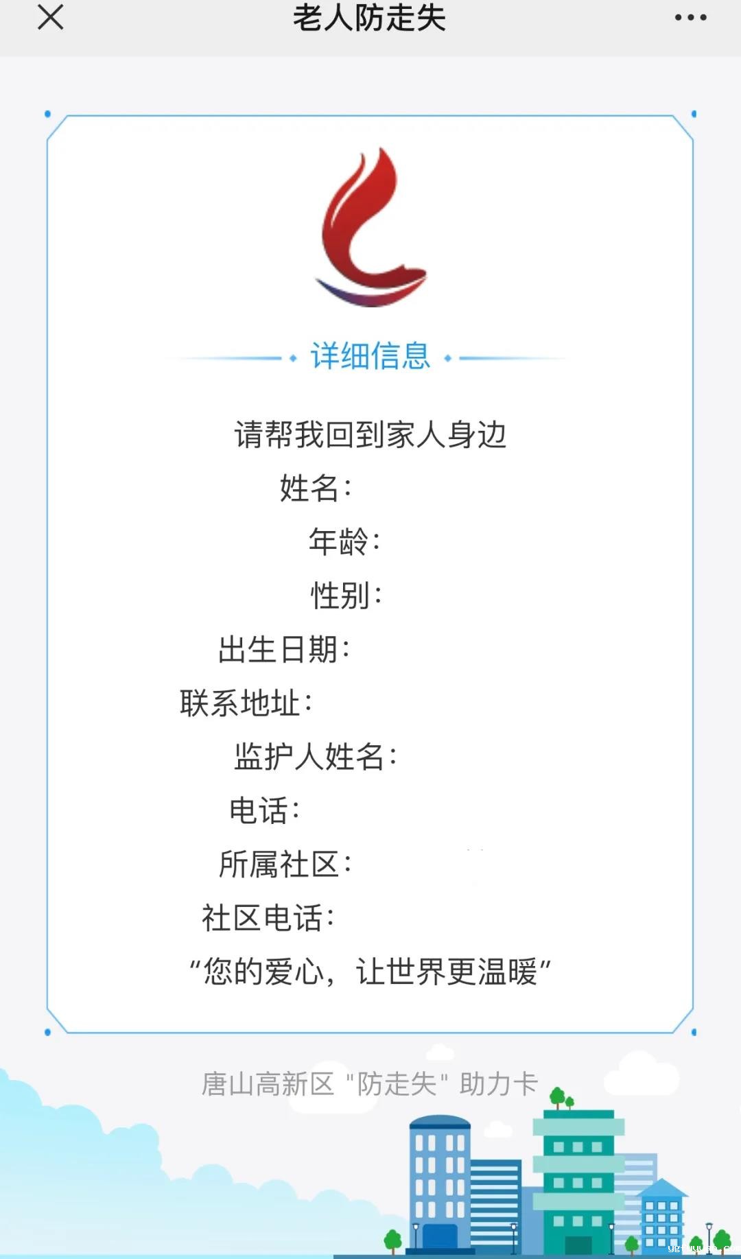 如果我不小心走丢了或者身体发生意外,防走失二维码第一时间帮我联系到社区工作人员和儿子,让我安心放心!
