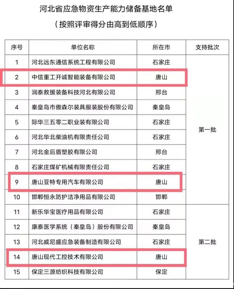 近日,河北省工业和信息化厅发布了《关于2021年河北省应急物资生产能力储备基地拟入选名单》,高新区中信重工开诚智能装备有限公司、唐山亚特专用汽车有限公司、唐山现代工控技术有限公司3家企业被省工信厅、省发改委、省科技厅联合认定为首批省应急物资生产能力储备基地。此次全省共认定企业15家,其中唐山市3家,全部花落高新。