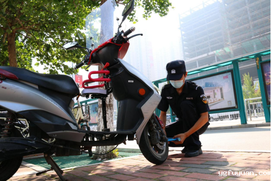 唐山市公安局高新公安分局的巡逻队员帮助忘记锁车的群众将车锁好。