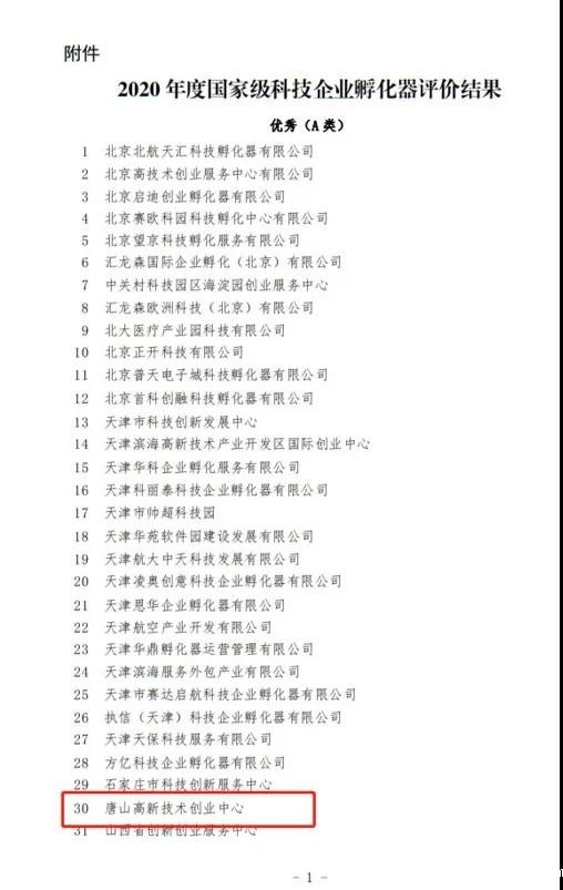 近日,科技部火炬中心公布了国家级科技企业孵化器2020年度考核评价结果,唐山高新技术创业中心以其完善的培育服务体系,在1287家国家级科技企业孵化器中脱颖而出,再度跻身考评优秀(A类)国家级孵化器之列,河北省仅3家孵化器获评本年度优秀(A类),全市仅此一家。至此,创业中心成为我市唯一一家连续七年获此殊荣的孵化器。