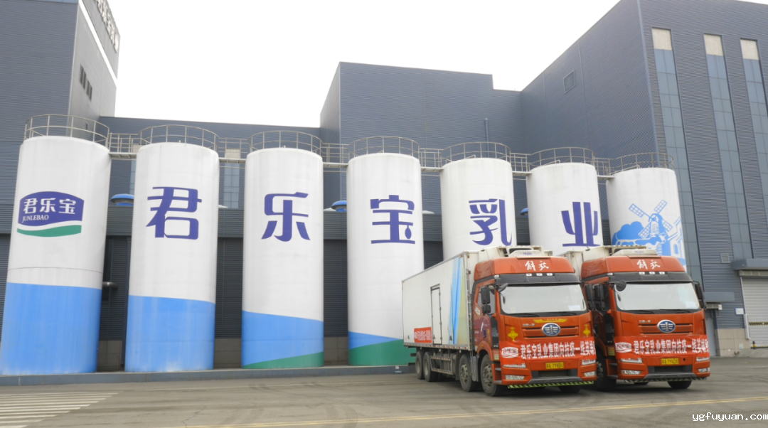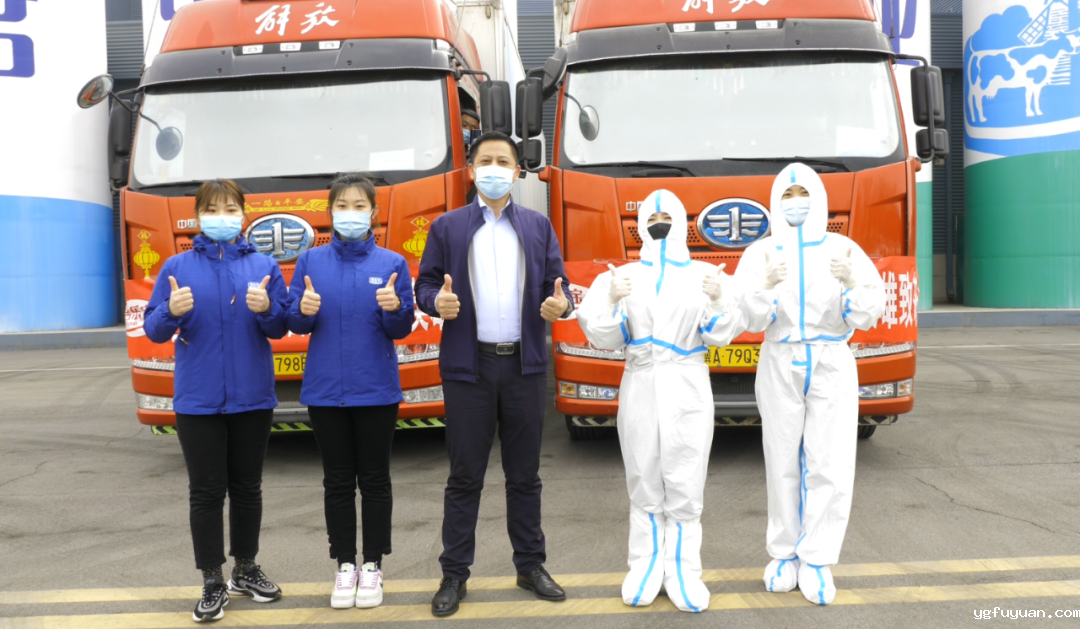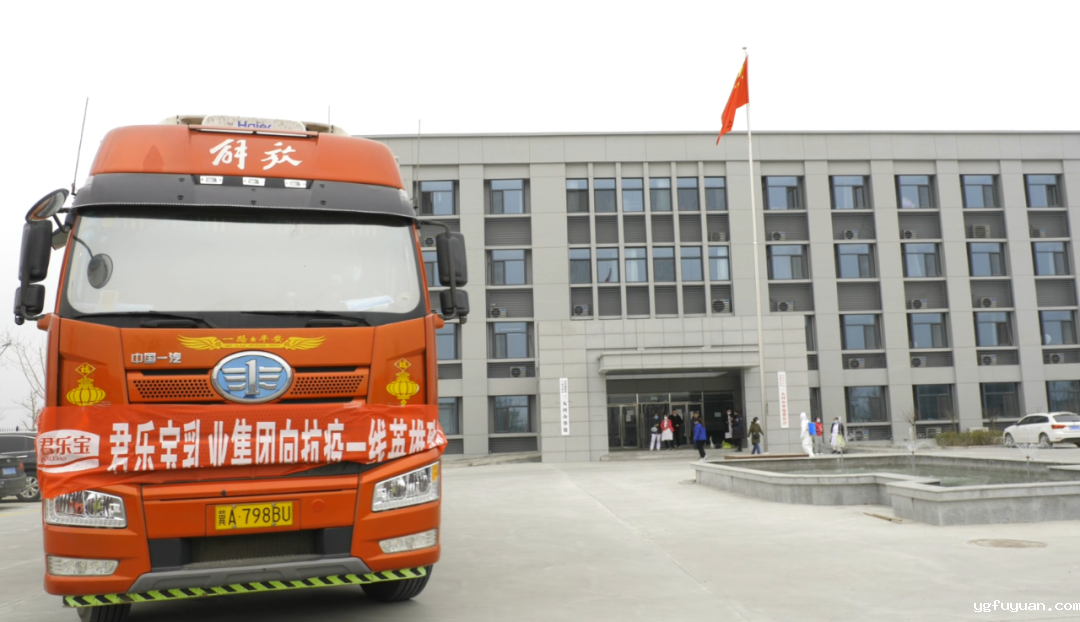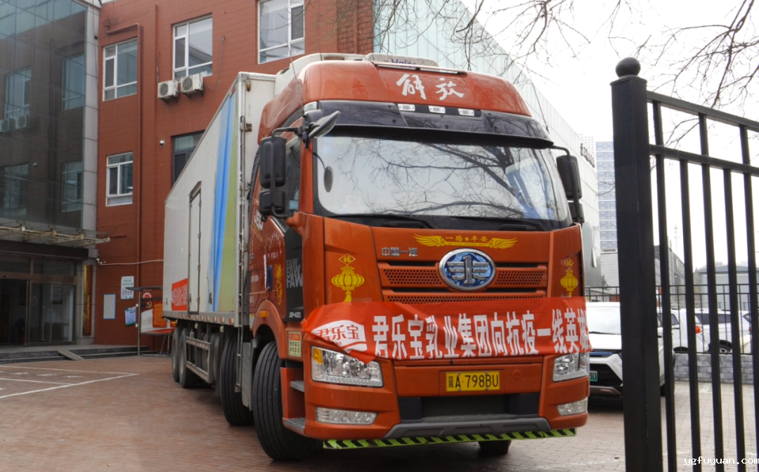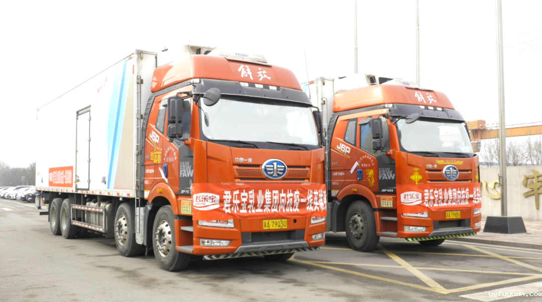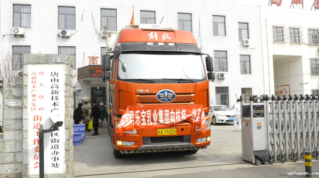 在君乐宝乳业唐山分公司,两辆满载着爱心酸奶的防疫物资车辆停放在公司门前,车头悬挂的“君乐宝乳业集团向抗疫一线英雄致敬”大红条幅格外显眼。在举行了简单的捐赠仪式后,君乐宝乳业与唐山高新区对爱心乳制品进行了交接。