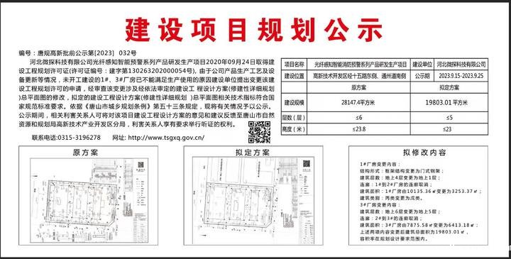 光纤感知智能消防预警系列产品研发生产项目(编号唐规高新批前公示第[2023]032号)