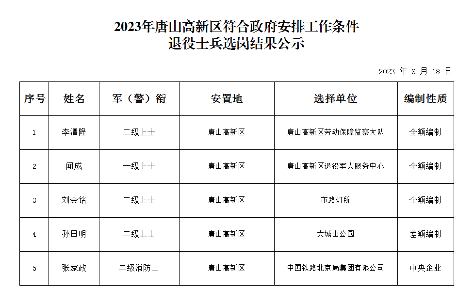 现将我区2023年符合政府安排工作条件退役士兵选岗结果予以公示,公示期为2023年8月18日至8月24日。退役士兵对公示内容如有异议,请在公示期内向退役军人安置部门提出书面申请,过期视为无异议。