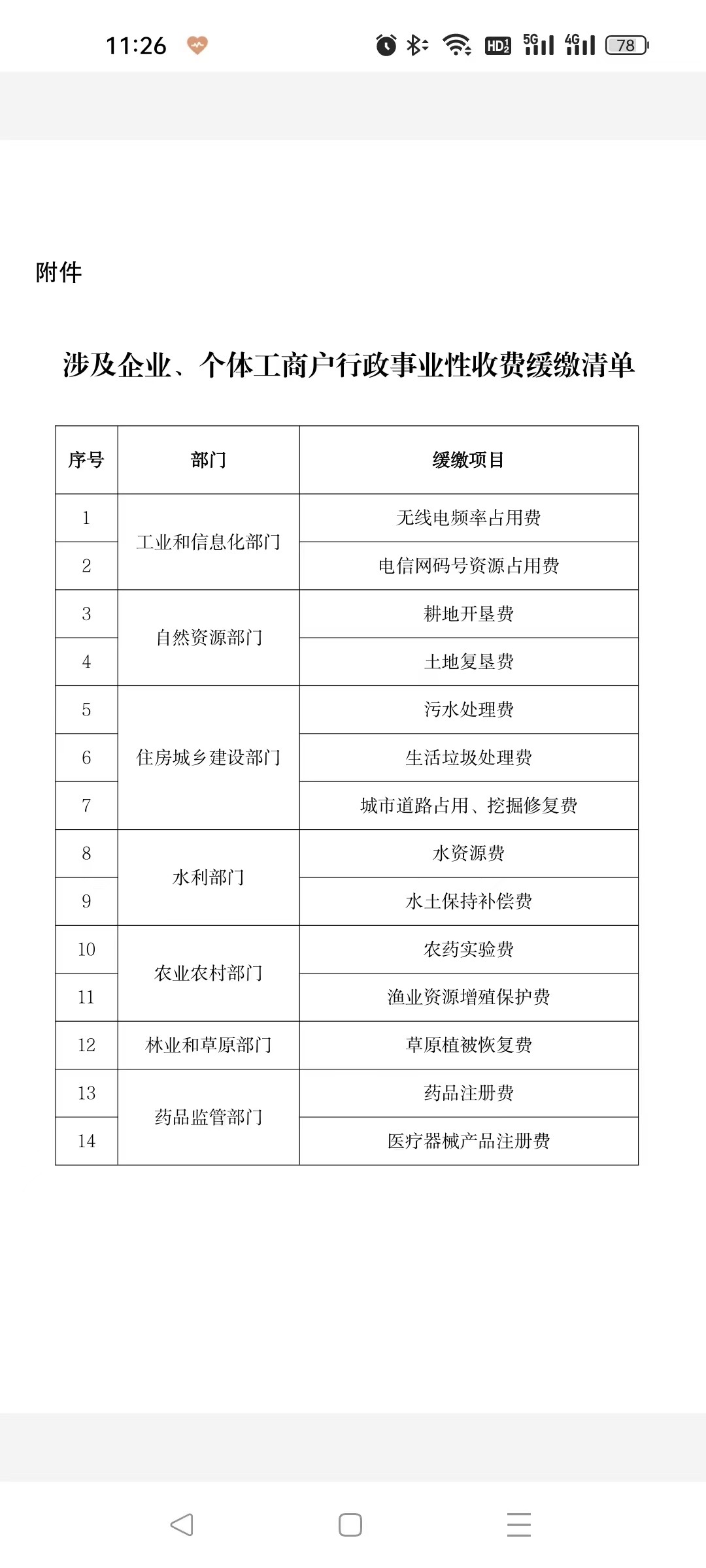 二、《涉及企业、个体工商户行政事业性收费缓缴清单》包括耕地开垦费、污水处理费等14项收费(具体项目见附件)。