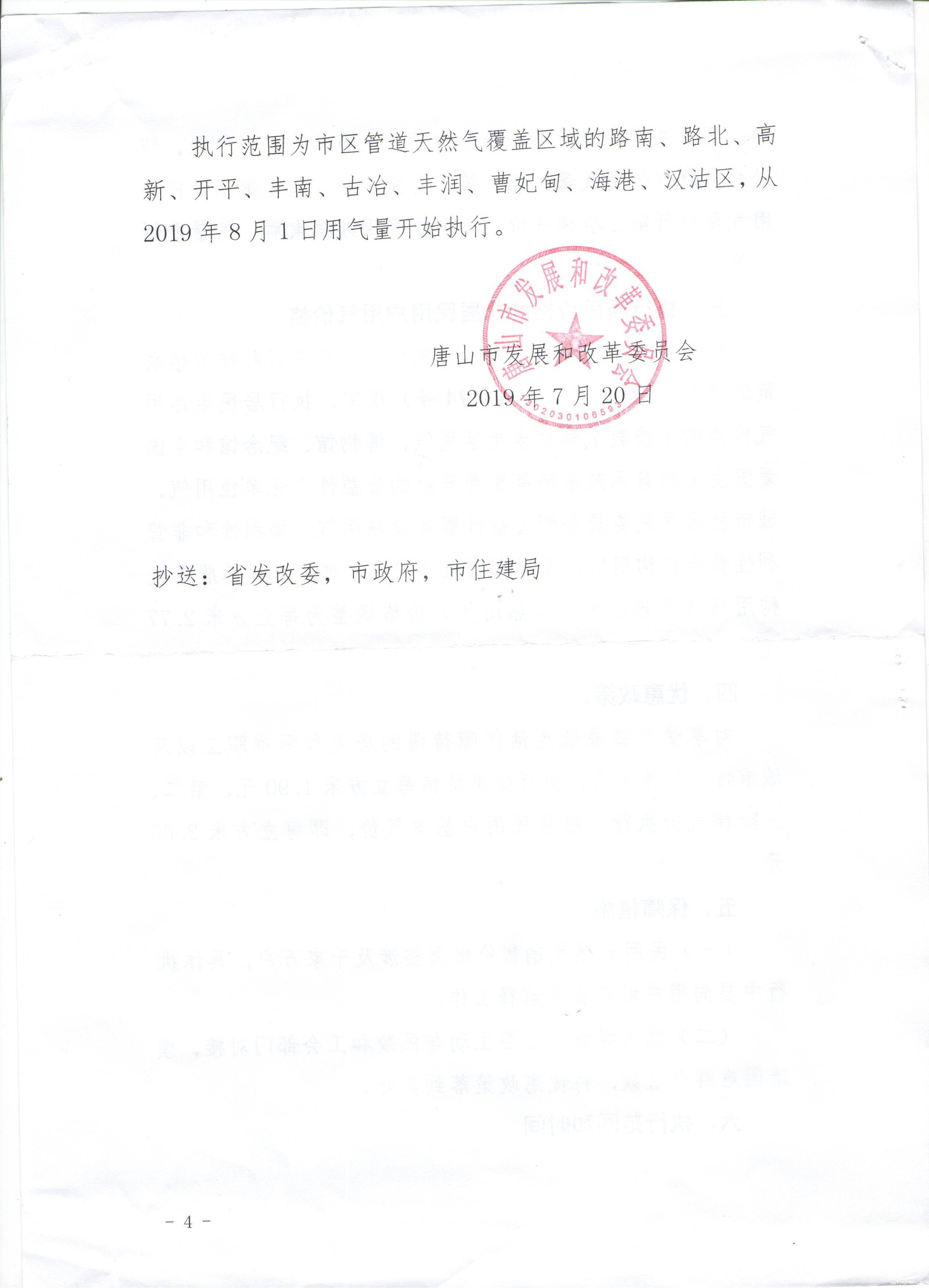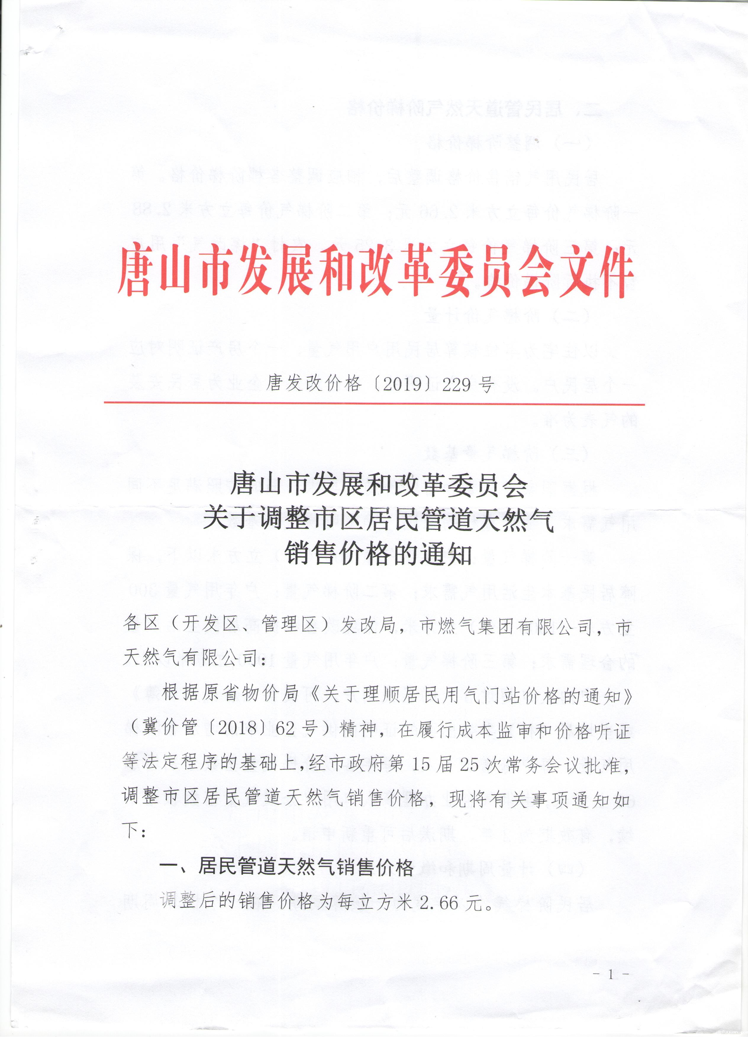 现转发唐山市发改委《关于调整市区居民管道天然气销售价格的通知》(唐发改价格〔2019〕229号)。