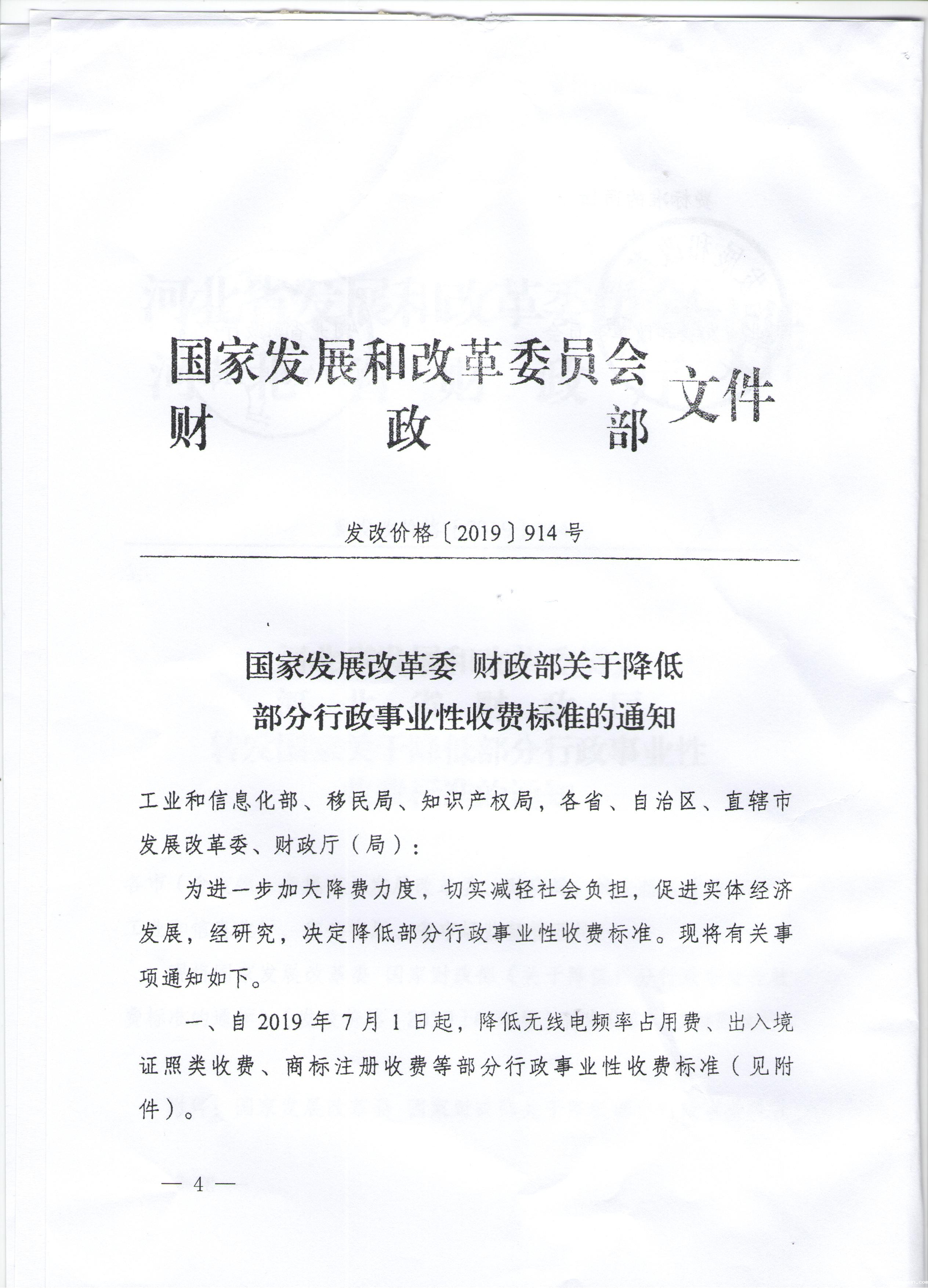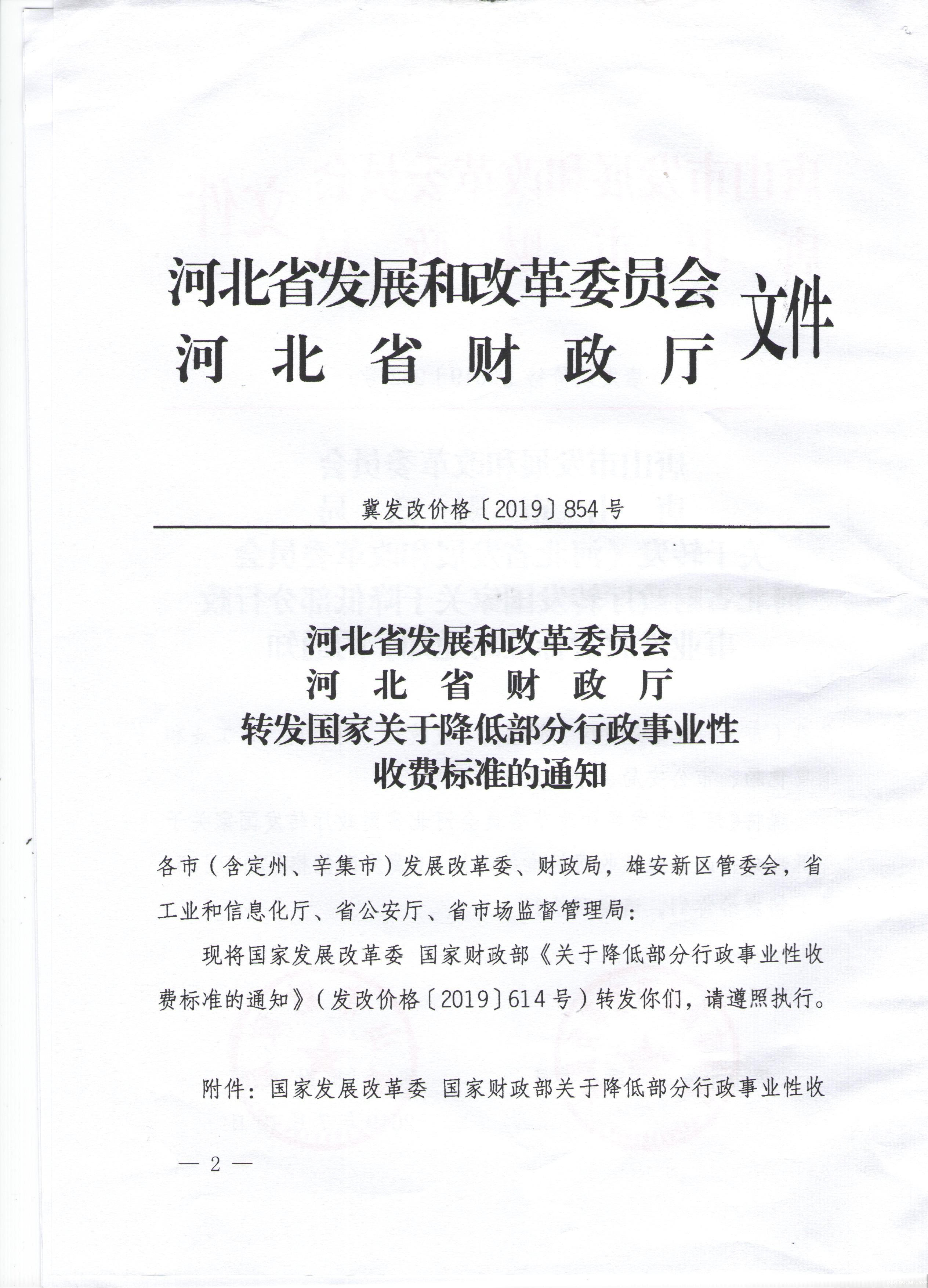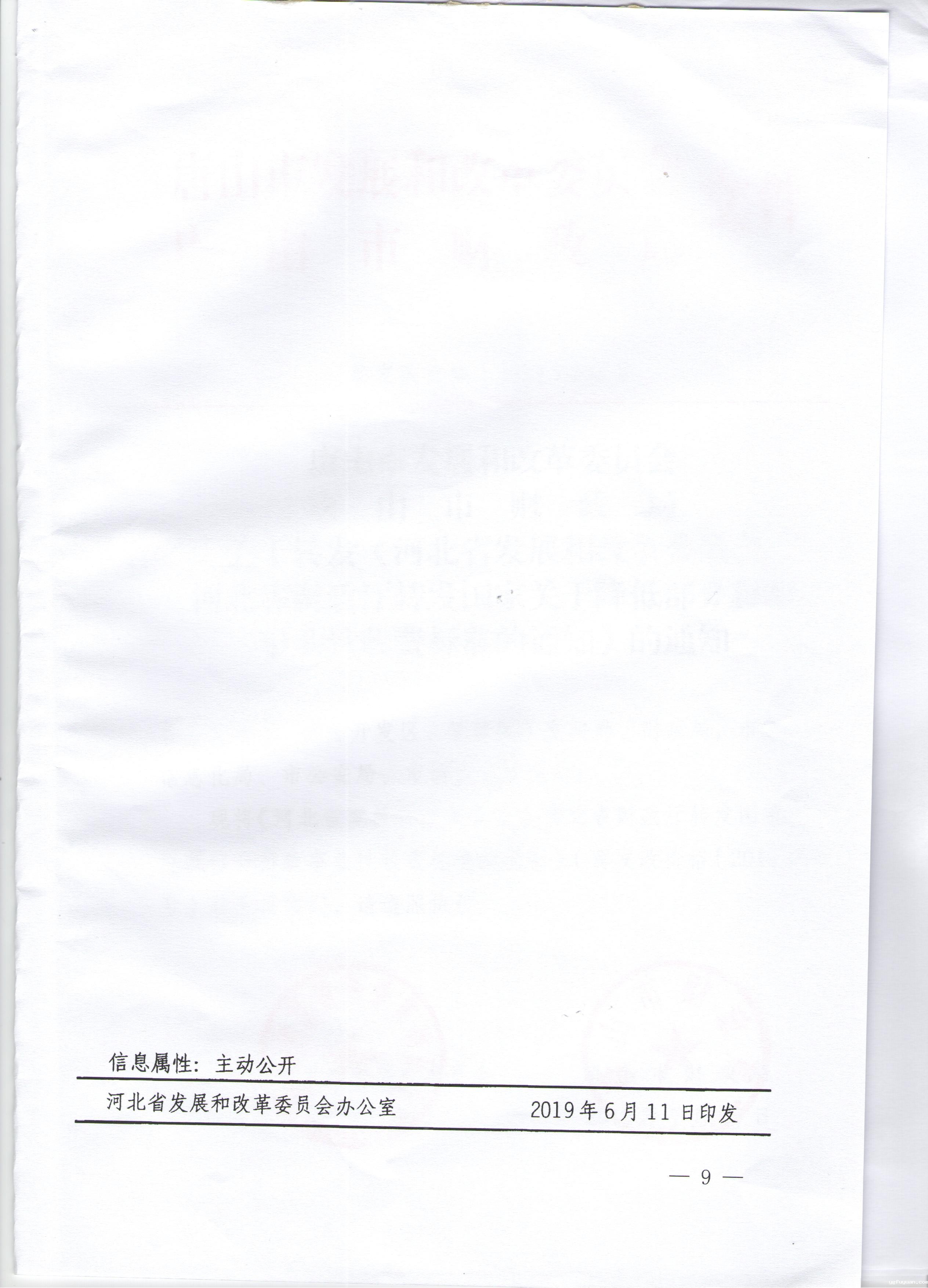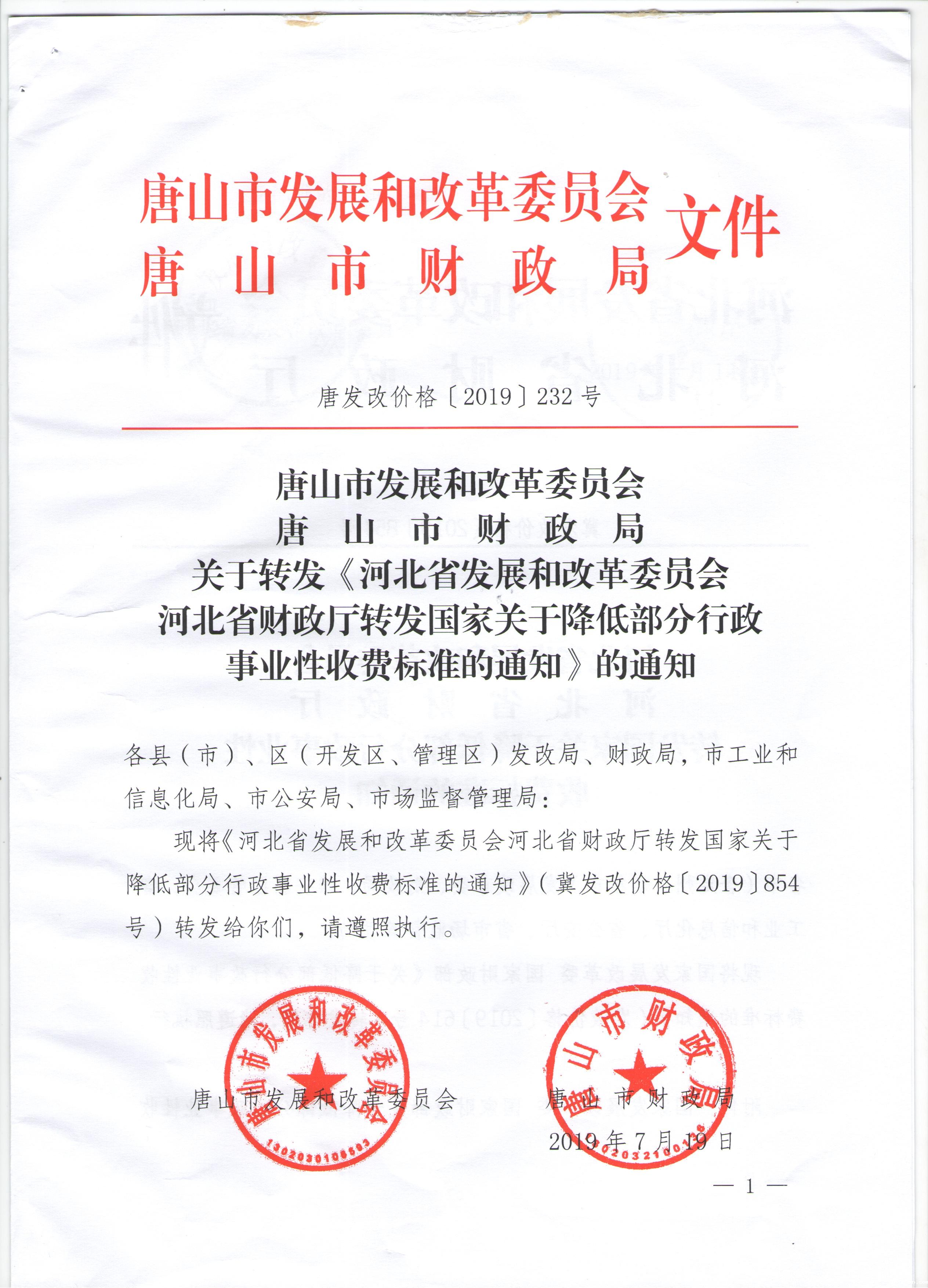 现转发唐山市发改委唐山市财政局关于转发《河北省发展和改革委员会河北省财政厅转发国家关于降低部分行政事业性收费标准的通知》(唐发改价格〔2019〕232号)。