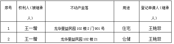 根据《不动产登记暂行条例实施细则》第十四条的规定,经初步查验,不动产登记机构拟对下列不动产权利办理不动产继承登记。根据《不动产登记暂行条例实施细则》第十七条的规定,现予公告。如有异议,请自本公告之日起90个工作日内,将异议书面材料送达不动产登记机构。逾期无人提出异议或者异议不成立的,不动产登记机构将予以登记。