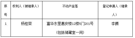 根据《不动产登记暂行条例实施细则》第十四条的规定,经初步查验,不动产登记机构拟对下列不动产权利办理不动产继承登记。根据《不动产登记暂行条例实施细则》第十七条的规定,现予公告。如有异议,请自本公告之日起90个工作日内,将异议书面材料送达不动产登记机构。逾期无人提出异议或者异议不成立的,不动产登记机构将予以登记。