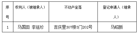 根据《不动产登记暂行条例实施细则》第十四条的规定,经初步查验,不动产登记机构拟对下列不动产权利办理不动产继承登记。根据《不动产登记暂行条例实施细则》第十七条的规定,现予公告。如有异议,请自本公告之日起90个工作日内,将异议书面材料送达不动产登记机构。逾期无人提出异议或者异议不成立的,不动产登记机构将予以登记。