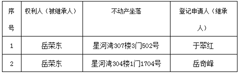 根据《不动产登记暂行条例实施细则》第十四条的规定,经初步查验,不动产登记机构拟对下列不动产权利办理不动产继承登记。根据《不动产登记暂行条例实施细则》第十七条的规定,现予公告。如有异议,请自本公告之日起90个工作日内,将异议书面材料送达不动产登记机构。逾期无人提出异议或者异议不成立的,不动产登记机构将予以登记。