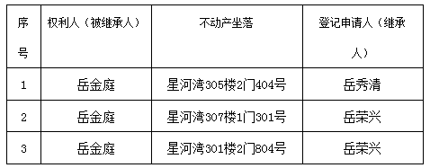 根据《不动产登记暂行条例实施细则》第十四条的规定,经初步查验,不动产登记机构拟对下列不动产权利办理不动产继承登记。根据《不动产登记暂行条例实施细则》第十七条的规定,现予公告。如有异议,请自本公告之日起90个工作日内,将异议书面材料送达不动产登记机构。逾期无人提出异议或者异议不成立的,不动产登记机构将予以登记。