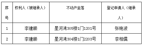 根据《不动产登记暂行条例实施细则》第十四条的规定,经初步查验,不动产登记机构拟对下列不动产权利办理不动产继承登记。根据《不动产登记暂行条例实施细则》第十七条的规定,现予公告。如有异议,请自本公告之日起90个工作日内,将异议书面材料送达不动产登记机构。逾期无人提出异议或者异议不成立的,不动产登记机构将予以登记。
