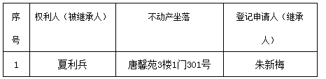 根据《不动产登记暂行条例实施细则》第十四条的规定,经初步查验,不动产登记机构拟对下列不动产权利办理不动产继承登记。根据《不动产登记暂行条例实施细则》第十七条的规定,现予公告。如有异议,请自本公告之日起90个工作日内,将异议书面材料送达不动产登记机构。逾期无人提出异议或者异议不成立的,不动产登记机构将予以登记。