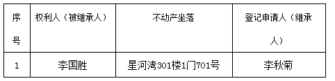 根据《不动产登记暂行条例实施细则》第十四条的规定,经初步查验,不动产登记机构拟对下列不动产权利办理不动产继承登记。根据《不动产登记暂行条例实施细则》第十七条的规定,现予公告。如有异议,请自本公告之日起90个工作日内,将异议书面材料送达不动产登记机构。逾期无人提出异议或者异议不成立的,不动产登记机构将予以登记。