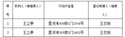根据《不动产登记暂行条例实施细则》第十四条的规定,经初步查验,不动产登记机构拟对下列不动产权利办理不动产继承登记。根据《不动产登记暂行条例实施细则》第十七条的规定,现予公告。如有异议,请自本公告之日起90个工作日内,将异议书面材料送达不动产登记机构。逾期无人提出异议或者异议不成立的,不动产登记机构将予以登记。