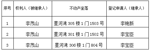 根据《不动产登记暂行条例实施细则》第十四条的规定,经初步查验,不动产登记机构拟对下列不动产权利办理不动产继承登记。根据《不动产登记暂行条例实施细则》第十七条的规定,现予公告。如有异议,请自本公告之日起90个工作日内,将异议书面材料送达不动产登记机构。逾期无人提出异议或者异议不成立的,不动产登记机构将予以登记。