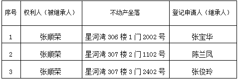 根据《不动产登记暂行条例实施细则》第十四条的规定,经初步查验,不动产登记机构拟对下列不动产权利办理不动产继承登记。根据《不动产登记暂行条例实施细则》第十七条的规定,现予公告。如有异议,请自本公告之日起90个工作日内,将异议书面材料送达不动产登记机构。逾期无人提出异议或者异议不成立的,不动产登记机构将予以登记。