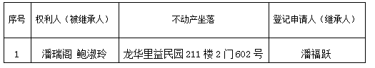 根据《不动产登记暂行条例实施细则》第十四条的规定,经初步查验,不动产登记机构拟对下列不动产权利办理不动产继承登记。根据《不动产登记暂行条例实施细则》第十七条的规定,现予公告。如有异议,请自本公告之日起90个工作日内,将异议书面材料送达不动产登记机构。逾期无人提出异议或者异议不成立的,不动产登记机构将予以登记。