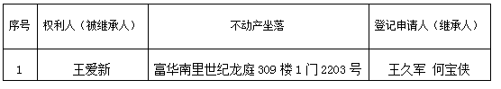 根据《不动产登记暂行条例实施细则》第十四条的规定,经初步查验,不动产登记机构拟对下列不动产权利办理不动产继承登记。根据《不动产登记暂行条例实施细则》第十七条的规定,现予公告。如有异议,请自本公告之日起90个工作日内,将异议书面材料送达不动产登记机构。逾期无人提出异议或者异议不成立的,不动产登记机构将予以登记。