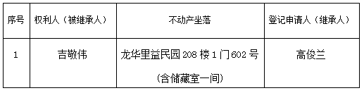 根据《不动产登记暂行条例实施细则》第十四条的规定,经初步查验,不动产登记机构拟对下列不动产权利办理不动产继承登记。根据《不动产登记暂行条例实施细则》第十七条的规定,现予公告。如有异议,请自本公告之日起90个工作日内,将异议书面材料送达不动产登记机构。逾期无人提出异议或者异议不成立的,不动产登记机构将予以登记。