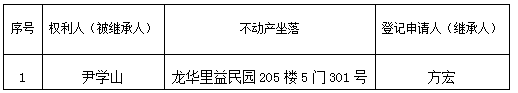 根据《不动产登记暂行条例实施细则》第十四条的规定,经初步查验,不动产登记机构拟对下列不动产权利办理不动产继承登记。根据《不动产登记暂行条例实施细则》第十七条的规定,现予公告。如有异议,请自本公告之日起90个工作日内,将异议书面材料送达不动产登记机构。逾期无人提出异议或者异议不成立的,不动产登记机构将予以登记。